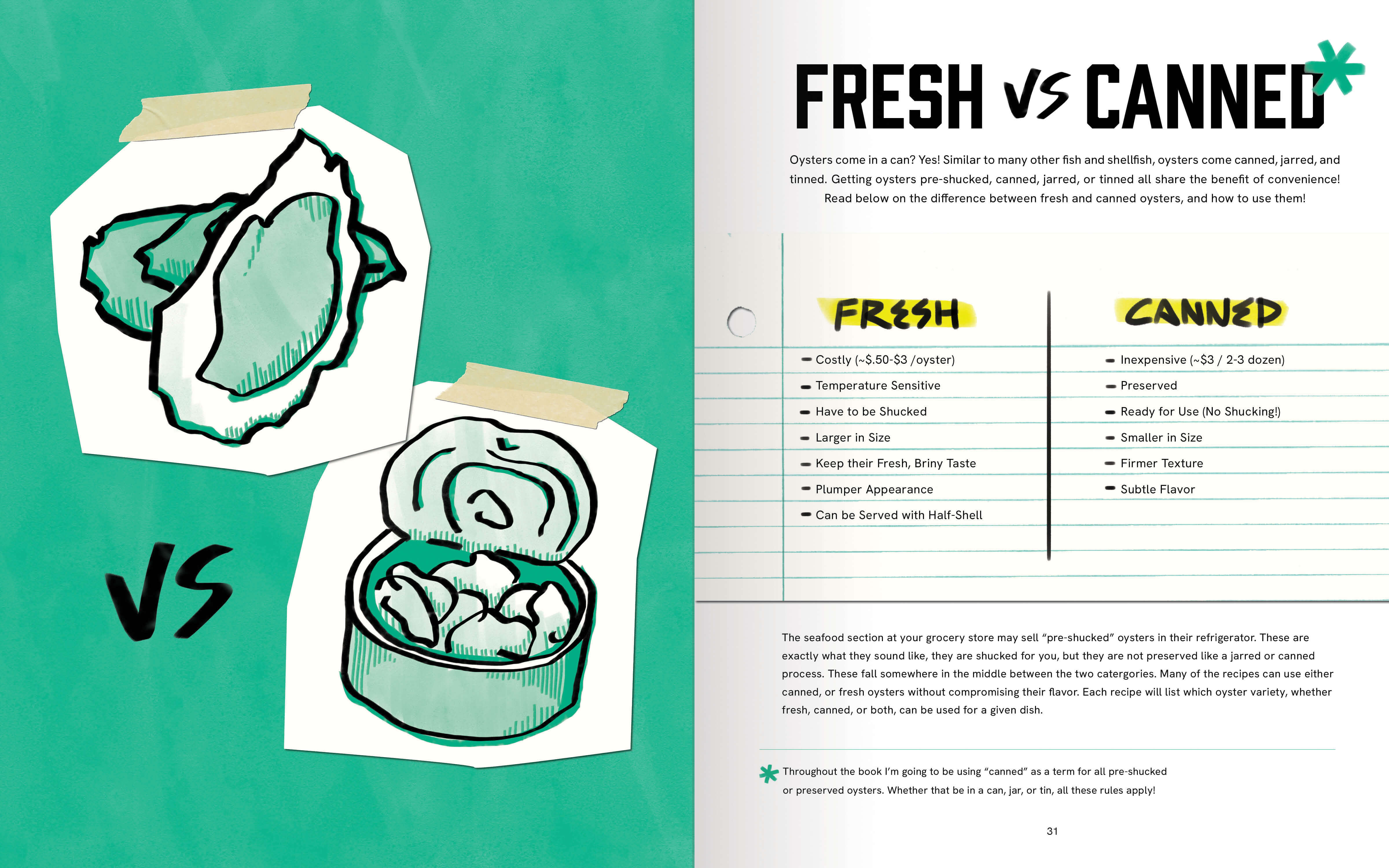 Vibrant colors, hand-drawn illustrations, and layered textures give Shucked a playful energy. The book also uses a cheeky, lighthearted voice. From its title to playful phrases like "Let's Shuck" and "Like it Raw?", the brand makes oysters fun, cover to cover!