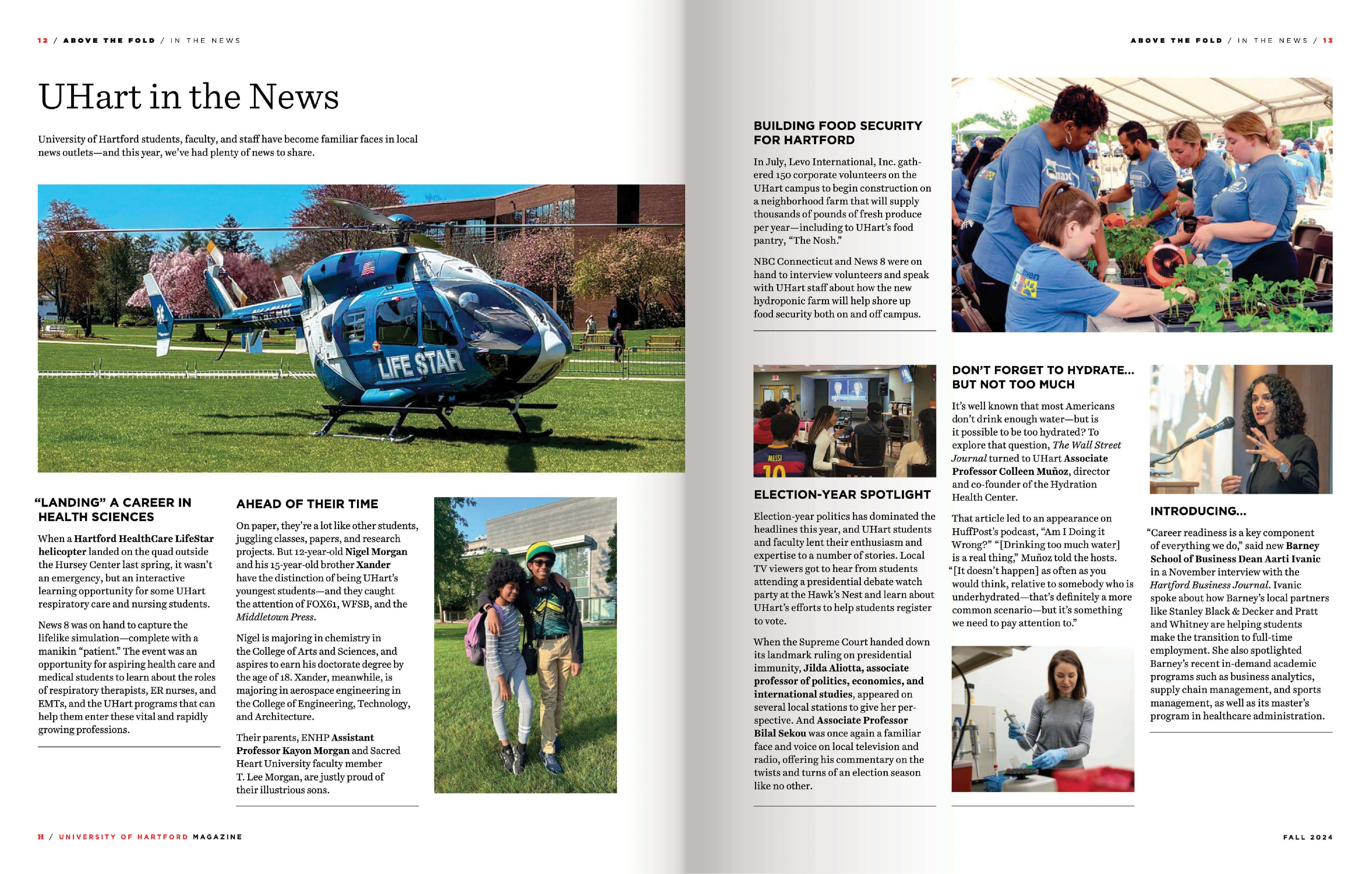 Various spread contributions to the University's print publication, H. The magazine keeps the campus community informed by introducing new university leadership, sharing success stories from our alumni, and showcasing campus happenings since the last issue.